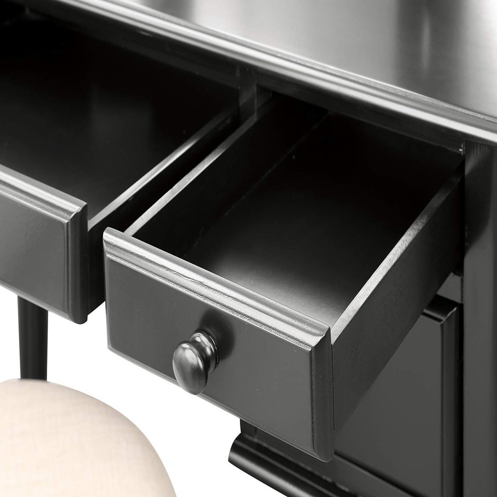 Descripción de la característica Color Negro Madera Fabricada en madera maciza alisada Cajón 5 cajones Silla Fabricada con cojín de espuma suave y tela beige similar al lino Dimensiones generales (pulgadas) 39 “L x 19.3” W x 56.7 “H Capacidad de peso Silla = 220 libras (100 kg), ensamblaje requerido Aproximadamente 30 minutos Información de los paquetes Dimensiones (pulgadas) Peso (libras) Paquete 1 44 “L * 23” W * 18 “H 78 Paquete 2 38 “L * 23” W * 5 “H 21 Punto de venta: 1. Juego de tocador completo 2. Un gran espejo arqueado central con espejos laterales ajustables 3. Taburete a juego 4. Estilo agradable